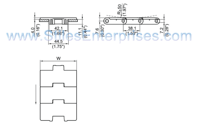 Slat Top 828 ChainSlat Top 828 Chain is a standard duty straight running only plastic chain. Top plate thickness is 4.00 mm. Applications include bottling and packaging lines. Use 828 series for side transfer with 770, 880, and 990 series radius chains. ![]() ![]() |